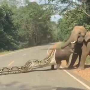 A dramatic moment has been captured on a road in the wild, where an adult elephant steps in to rescue its calf from a massive python that…
