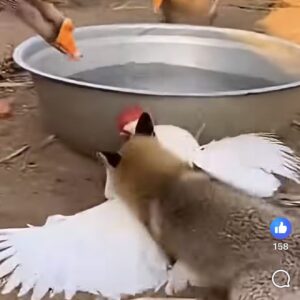 In the middle of what seems like a calm outdoor setting, tension rises as a wolf suddenly lunges toward a rooster near a water basin. The moment…