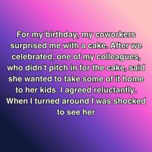 For my birthday, my coworkers surprised me with a cake. After we celebrated, one of my colleagues, who didn’t pitch in for the cake, said she wanted…