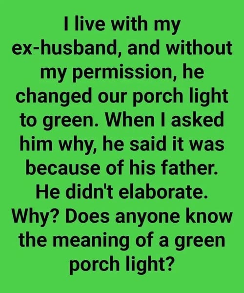 I live with my ex-husband, and without my permission, he changed our porch light to green. When I asked him why, he said it was because of his father who passed away recently. He didn’t elaborate. Why? What does a green porch light mean?
