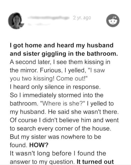 I got home and heard my husband and sister giggling in the bathroom. A second later, I saw them kissing in the mirror. Furious, I yelled, “I saw you two kissing! Come out!”