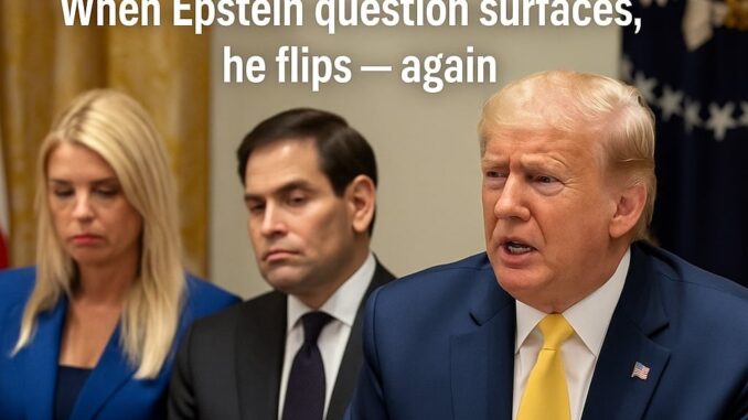 Beside him, Pam Bondi distanced herself, saying she had no knowledge of any such ties. But the question hit a nerve — and Trump’s reaction only added fuel to growing public speculation.