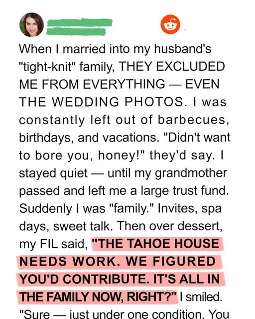 At dinner one night—my third invite that month—Grant leaned back in his chair and said casually, “The Tahoe house needs some upgrades. A new deck. A better kitchen. Something worthy of family holidays.”
