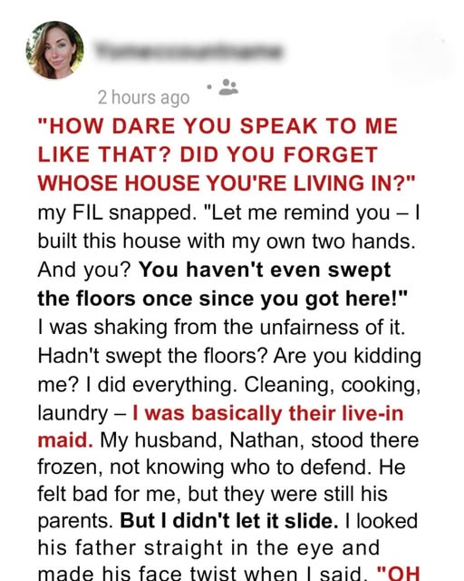 When my father-in-law screamed, “Did you forget whose house you’re living in?” over a spilled mop bucket, something inside me broke. I’d spent a full year scrubbing his floors, cooking meals no one thanked me for, and folding laundry that wasn’t mine. All while my husband, Nathan, promised “soon” we’d have our own place. It started with compromise: “Let’s live with my parents to save money,” Nathan said. “It’ll be quick.” I said yes. We moved into his childhood bedroom, a museum of plastic-covered furniture and cold glances from his mom.