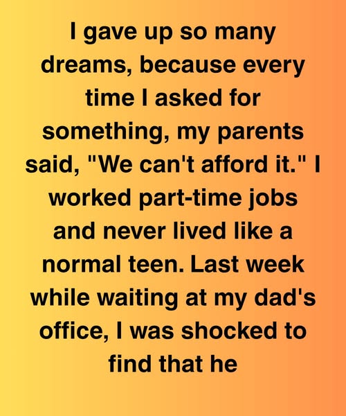 I gave up so many dreams, because every time I asked for something, my parents said, “We can’t afford it.” I worked part-time jobs and never lived like a normal teen. Last week while waiting at my dad’s office, I was shocked to find that he had a Rolex tucked inside his desk drawer—right next to a private bank statement with more zeroes than I’ve ever seen in my entire life.