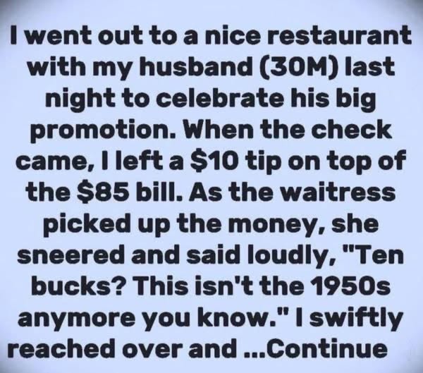 After enjoying their meal, Amelia left a $10 tip on an $85 bill. However, the waitress responded with a sneer, saying, “Ten bucks? This isn’t the 1950s anymore.”