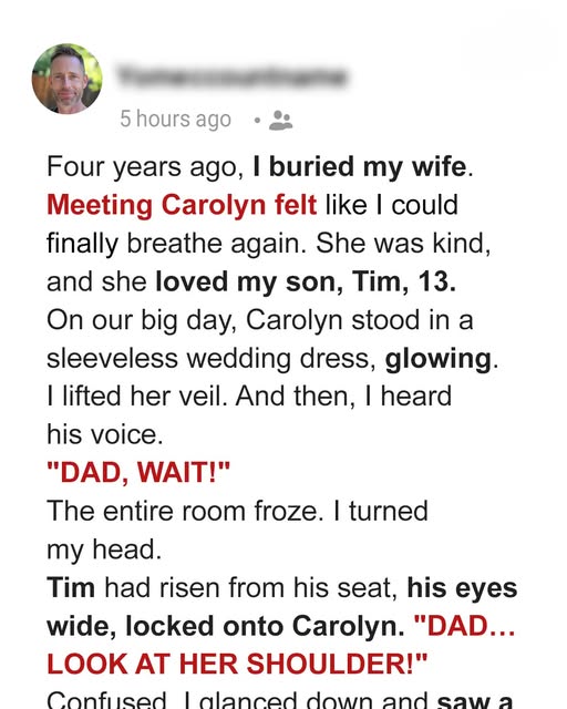 The chapel was wrapped in silence, holding its collective breath as I stood across from Carolyn, moments away from saying “I do.” Just as I lifted her veil, my 13-year-old son, Tim, called out, “Dad, wait look at her shoulder!” Confused, I followed his gaze to a small, butterfly-shaped birthmark on Carolyn’s right shoulder. Tim continued, “Emma has the same one. Our science teacher said those can be genetic.” Emma, his classmate, had mentioned that very mark before. Carolyn’s face went ghostly white. The joy in the room faded into stunned stillness.