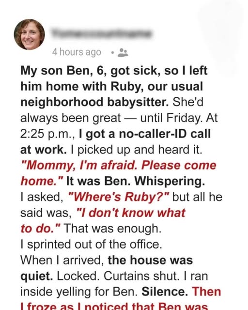 You don’t expect your world to tilt at 2:25 on a Friday. But that’s when my phone lit up with my six‑year‑old’s voice, barely a whisper: “Mommy… I’m afraid.” I froze. “Ben? What’s wrong?” “She was standing… then she wasn’t. I tried to help, but Ruby won’t wake up.” Ruby, our sweet babysitter, only twenty‑one….