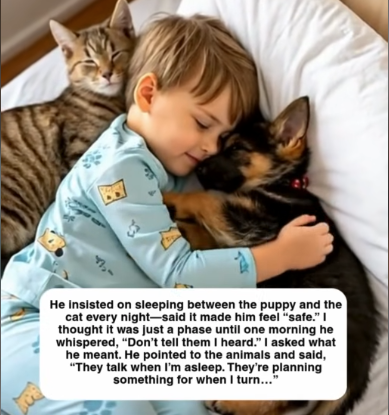 He insisted on sleeping between the puppy and the cat every night—said it made him feel “safe.” I thought it was just a phase until one morning he whispered, “Don’t tell them I heard.” I asked what he meant. He pointed to the animals and said, “They talk when I’m asleep. They’re planning something for when I turn…”