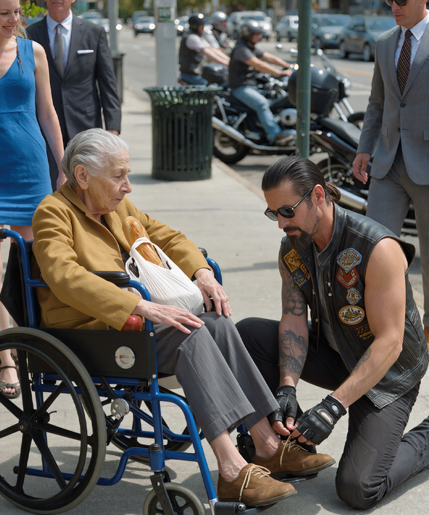It was a man in a leather vest, tattoos down his arms, gloves worn from riding. He knelt on the pavement—not hurried, not annoyed—and tied my shoes with the care of someone handling silk.
