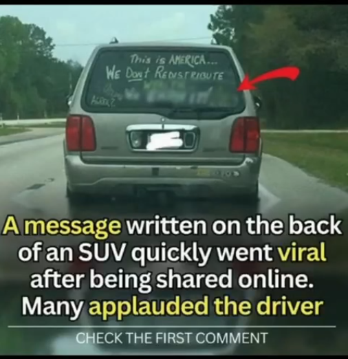 After a phrase written on the back of an SUV was uploaded online, it quickly gained attention. A Reddit user posted a photo of the vehicle, and many users praised the driver for displaying the message. The post included a caption saying, “Saw this patriot while driving.” The message on the back of the SUV read, “This is America… we don’t redistribute wealth—we earn it.” Many readers expressed agreement with the driver’s stance on wealth distribution. One commenter applauded the driver, saying, “Kudos to the person who boldly put this on their back window! More people should follow suit, and who knows? It might even reach some of the freeloaders who think they should be paid for doing nothing!”