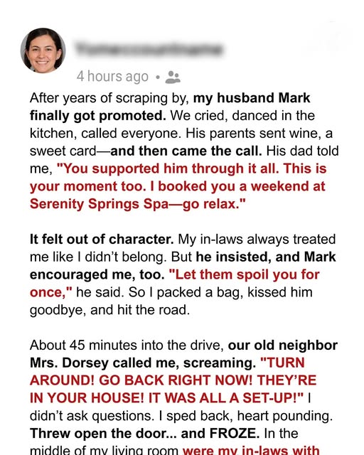 About 45 minutes into the drive, our old neighbor Mrs. Dorsey called me, screaming. “TURN AROUND! GO BACK RIGHT NOW! THEY’RE IN YOUR HOUSE! IT WAS ALL A SET-UP!” I didn’t ask questions. I sped back, heart pounding. Threw open the door… and FROZE. In the middle of my living room were my in-laws with armfuls of boxes, sorting through our things like they were moving in.