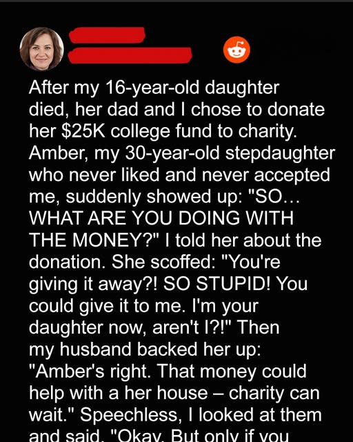After my 16-year-old daughter died, her dad and I chose to donate her $25K college fund to charity. Amber, my 30-year-old stepdaughter who never liked and never accepted me, suddenly showed up:
