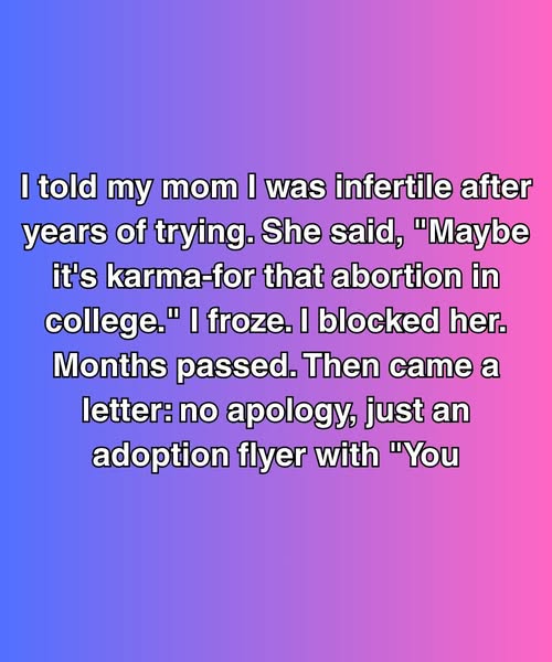 I told my mom I was infertile after years of trying. She said, “Maybe it’s karma—for that abortion in college.” I froze. I blocked her. Months passed. Then came a letter: no apology, just an adoption flyer with “You” written across the baby’s photo.