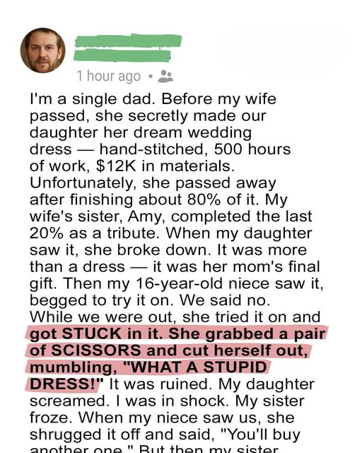 My late wife, Linda, spent nearly 500 hours hand-sewing a wedding dress for our daughter, Sammy. It cost $12,000 and was her final act of love before passing away from cancer. The dress was almost finished when Linda passed, and her sister, Amy, lovingly completed it. When Sammy saw it, she cried, saying she could…