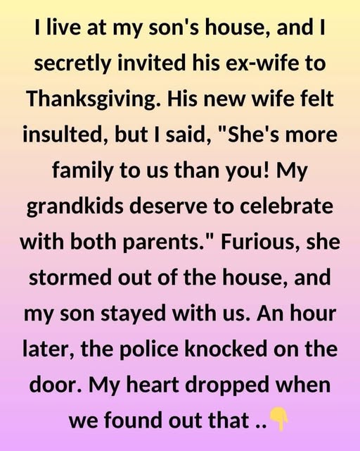 I live at my son’s house, and I secretly invited his ex-wife to Thanksgiving dinner. His new wife felt insulted, but I said, “She’s more family to us than you! My grandkids deserve to celebrate with both parents.” Furious, she stormed out of the house, and my son stayed with us.