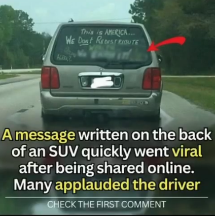 The post included a caption saying, “Saw this patriot while driving.” The message on the back of the SUV read, “This is America… we don’t redistribute wealth—we earn it.” Many readers expressed agreement with the driver’s stance on wealth distribution. One commenter applauded the driver, saying, “Kudos to the person who boldly put this on their back window! More people should follow suit, and who knows? It might even reach some of the freeloaders who think they should be paid for doing nothing!”