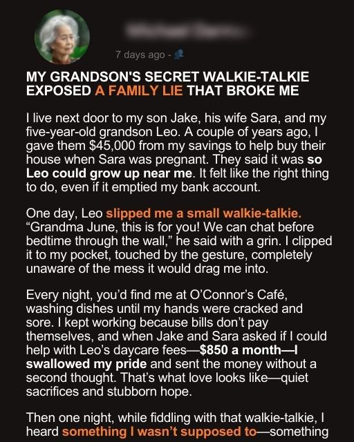 One day, Leo slipped me a small walkie-talkie. “Grandma June, this is for you! We can chat before bedtime through the wall,” he said with a grin. I clipped it to my pocket, touched by the gesture, completely unaware of the mess it would drag me into.