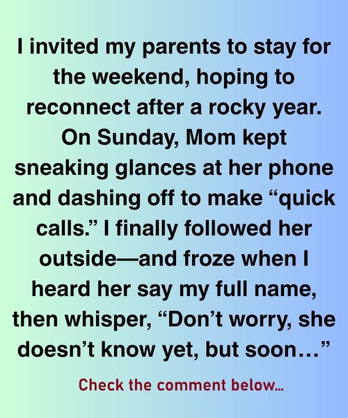 I invited my parents to stay for the weekend, hoping to reconnect after a rocky year. On Sunday, Mom kept sneaking glances at her phone and dashing off to make “quick calls.” I finally followed her outside—and froze when I heard her say my full name, then whisper, “Don’t worry, she doesn’t know yet, but soon…”