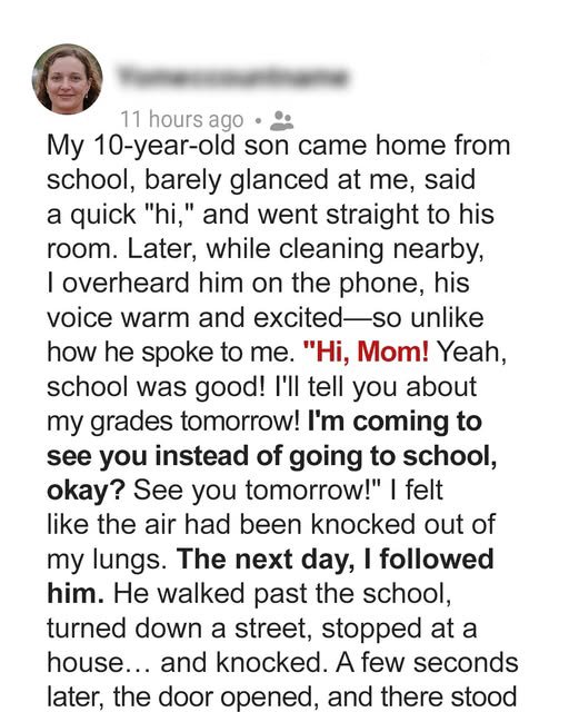 I never imagined that following my ten-year-old son would shatter the life I thought I had. After returning from a work trip, I overheard him call someone else “Mom.” Confused and uneasy, I followed him the next morning. Instead of going to school, he walked to a small house. A young woman opened the door, hugged him warmly, and led him inside. My heart dropped.
