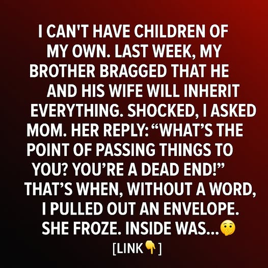 I can’t have children of my own. Last week, during a family dinner, my brother leaned back in his chair with a smug smile and announced that he and his wife would inherit everything from my parents one day. He said it almost like a victory, as if life had handed him a prize simply for having kids. Shocked, I turned to my mom. “Is that true?” I asked, my voice quieter than I meant it to be. Her answer was sharper than I expected. “What’s the point of passing things to you? You’re a dead end.” The words stung. My chest tightened, and for a moment I couldn’t breathe.