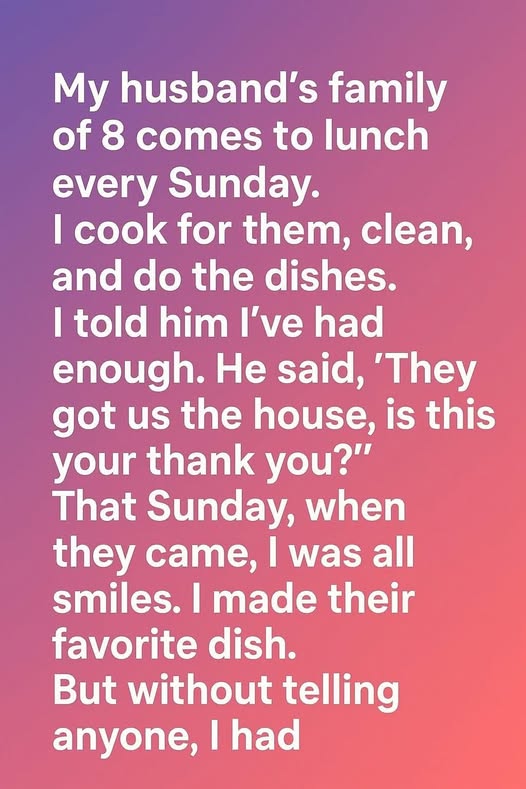 Every Sunday, Mia’s house turned into a bustling gathering spot for her husband’s family of eight. She would wake up early to prepare their favorite dishes, set the table perfectly, and clean every corner of the kitchen. After lunch, she was the one washing dishes while everyone chatted in the living room. It had become…