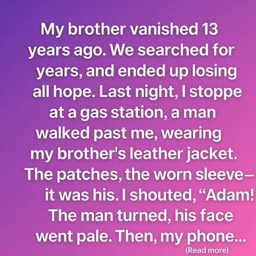 We searched everywhere—filed reports, followed dead-end leads, even hired private investigators. For years, every phone call made my heart leap, hoping it was news. But as time passed, hope slowly withered, replaced by the dull ache of not knowing. Last night, everything changed. I stopped at a gas station on my way home from work. As I was paying for fuel, a man walked past me. My eyes caught on his jacket—a leather jacket, worn at the sleeve, covered in patches. My brother’s jacket.