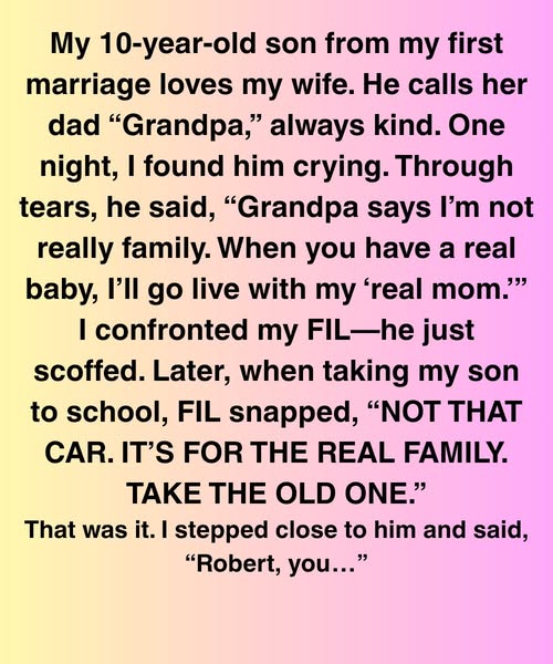 My 10-year-old son from my first marriage loves my wife. He calls her dad ‘Grandpa,’ always kind. One night, I found him crying. Through tears, he said, ‘Grandpa says I’m not really family. When you have a real baby, I’ll go live with my ‘real mom.’’ I confronted my FIL—he just scoffed. Later, when taking my son to school, FIL snapped, ‘NOT THAT CAR. IT’S FOR THE REAL FAMILY. TAKE THE OLD ONE.’ That was it. I stepped close to him and said, ‘Robert, you… are crossing a line you can’t uncross.” My voice shook, but I didn’t back down. I could see his smug expression drop, but he recovered quickly, waving me off like I was a child throwing a tantrum.
