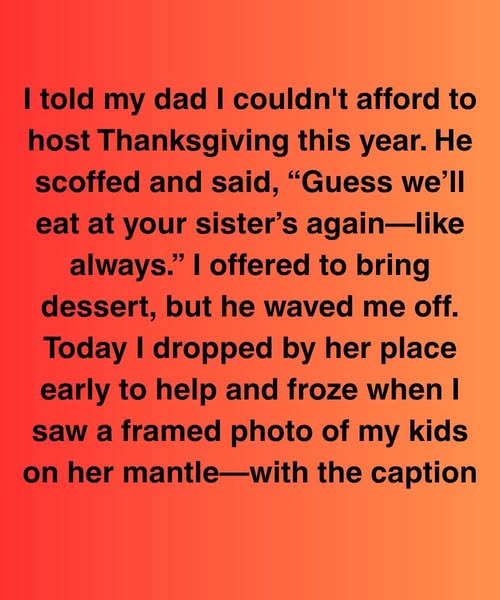 I told my dad I couldn’t afford to host Thanksgiving this year. He scoffed and said, “Guess we’ll eat at your sister’s again—like always.” I offered to bring dessert, but he waved me off. Today I dropped by her place early to help and froze when I saw a framed photo of my kids on her mantle—with the caption “My Babies—The Ones I Raised Right.”