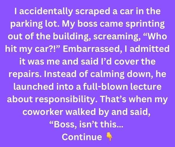 But before I could say a word, the glass doors flew open, and my boss came charging out like a storm cloud. “Who hit my car?!” he yelled, his voice echoing across the lot. Everyone in the office peeked through the windows. My face burned with embarrassment.