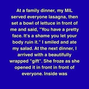 At a family dinner, my MIL served everyone lasagna, then set a bowl of lettuce in front of me and said, “You have a pretty face. It’s…