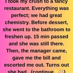 I took my crush to a fancy restaurant. Everything was perfect; we had great chemistry. Before dessert, she went to the bathroom to freshen up. 15 minutes…