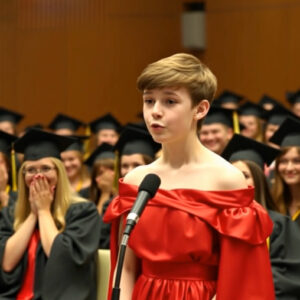 “I know why you’re laughing,” he said, his voice soft but steady, echoing through the auditorium. “You see a boy in a dress and you find it…