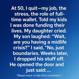 At 50, I quit. My job, the stress, the polite meetings where I smiled through gritted teeth. I’d saved enough to breathe for a while. What I…
