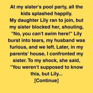 At my sister’s pool party, all the kids splashed happily. My daughter Lily ran to join, but my sister blocked her, shouting, “No, you can’t swim here!”…
