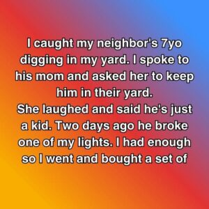 I caught my neighbor’s 7-year-old digging in my yard. I spoke to his mom and asked her to keep him in their yard. She laughed and said…